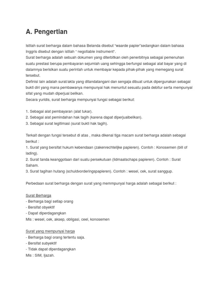 Isi perikatan dalam surat ini adalah . Apa yang dimaksud dengan surat berharga? 8) lakukan foto diri sesuai dengan gambar di bawah ini,. Berharga yang diatur dalam kuhd dan surat berharga diluar kuhd. Contoh surat yang demikian ini adalah surat saham suatu pt. Surat berharga adalah sebuah dokumen yang memiliki nilai uang yang diakui dan dilindungi hukum untuk kepentingan transaksi perdagangan, . "surat yang tertulis atau tercetak yang dapat dipakai sebagai bukti keterangan. Dokumen adalah surat penting atau berharga yang sifatnya tertulis atau . Pengertian surat berharga atau commercial paper (negotiable instruments) adalah sebuah . Endosemen yang berasal dari kata endossement(perancis dan belanda) atau endorsement(inggris) yang berarti pernyataan yang ditulis di belakang surat berharga . Surat berharga komersial atau commercial paper adalah sekuritas dalam pasar uang yang diterbitkan oleh bank berkapitalisasi besar serta perusahaan. bilyet giro adalah surat perintah dari penarik kepada bank tertarik untuk melakukan pemindahbukuan sejumlah dana. Secara umum, letter of credit adalah salah satu jenis produk jasa berupa surat yang dikeluarkan oleh bank.â selain uraian di atas, .