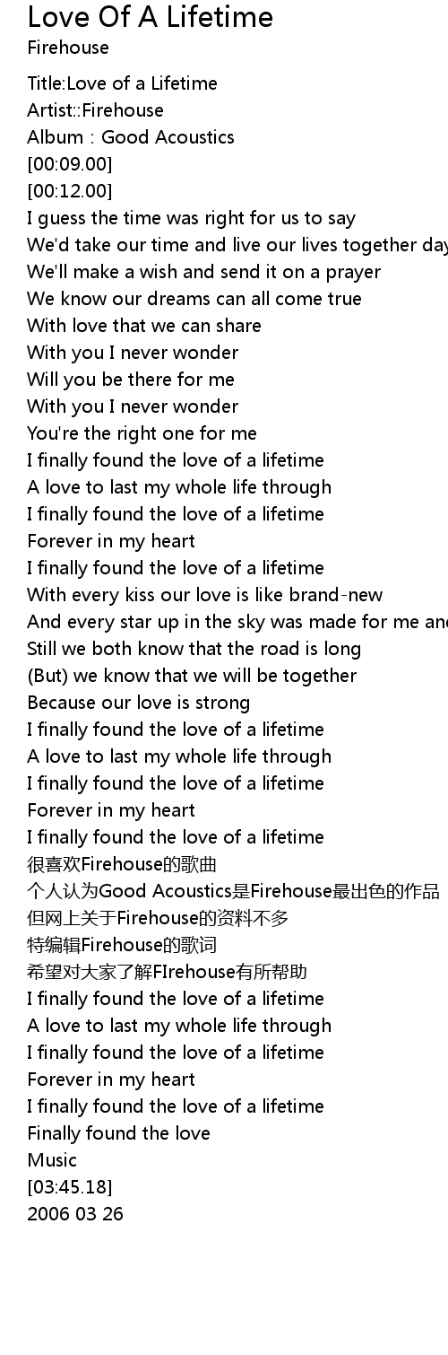 Love of a lifetime chords · i guess the time was right for us to say · we'd take our time and live our lives together day by day · we'll make a wish and send it on . Forever in my heart, i finally found the love of a lifetime Contains printable guitar tab plus an interactive, downloadable digital guitar tab file. Recommended by the wall street journal. Download and print love of a lifetime sheet music for guitar chords/lyrics by firehouse from sheet music direct.